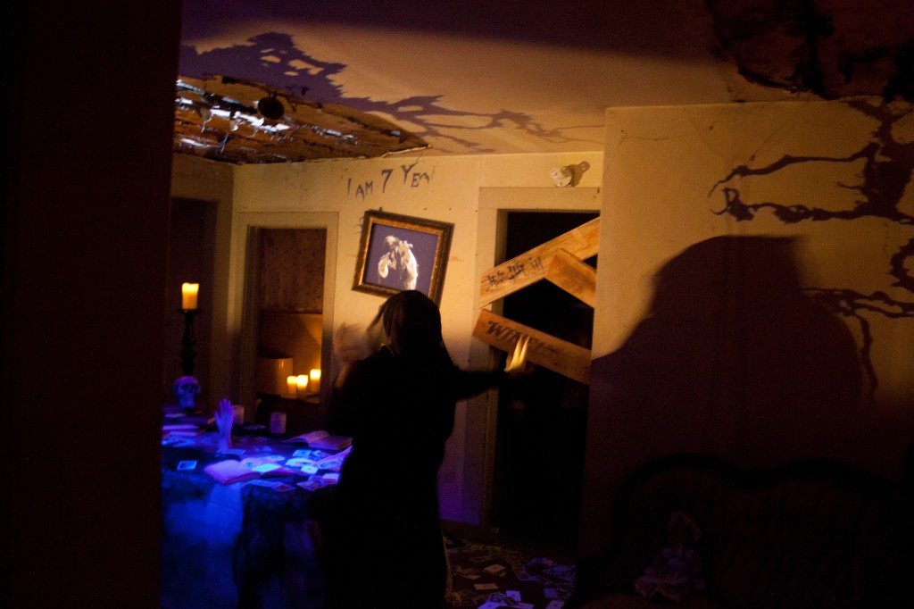 The climax of the maze is the seance scene with Sarah Winchester herself, dressed in black and calling the spirits. There are some pretty awesome effects in this room. We found ourselves completely stopped to just watch what was happening. But don’t linger too long, because there are Native American spirits lurking just around the corner!