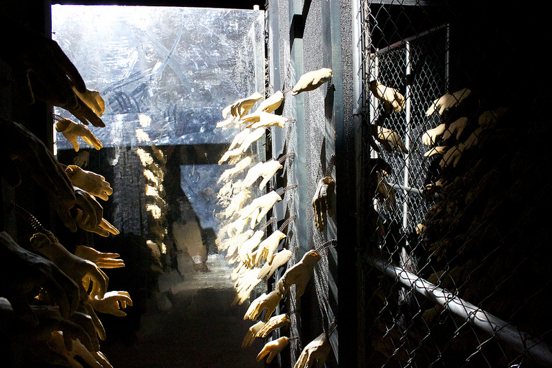 The Cage is one of the most unique haunt concepts we’ve ever experienced. There’s no real story to this maze; rather, the entire experience is like taking a crazed stroll through a junkyard while high on bath salts. The maze is almost all in black, white, and silver: the walls are black, the monsters’ masks are white, and a metal fencing surrounds everything. The soundtrack goes perfectly with the feeling of the maze: loud, jarring, and disorienting. The maze begins in a tunnel of lights, the floor shifting beneath you. You then go through a set of black curtains, and you cannot see a single thing. In fact, this part can be tricky to get through at all. We found ourselves turned around several times trying to find our way through, which is a perfect entrance to the rest of the disorienting maze. Lights flash, hands come out of walls, and sparks fly. Sometimes mazes don’t need an elaborate back story to be effective, but the consistent feeling in this maze makes it truly unique and one of our very favorites.