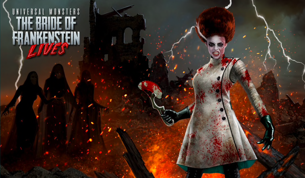 The Bride of Frankenstein is stepping out of the shadows and taking her fate into her own bloody hands. The terror begins when you enter the tower ruins where Frankenstein’s monster pulled the lever to bring down the walls and destroy him and his Bride. You’ll recoil in horror as she tries to bring him back at any cost, honing her diabolical genius one harvested body part at a time but don’t get caught between her and the Brides of Dracula, who she captures and drains in hopes of reanimating her love. In the end, the mate will have her monster and the monster his mate.